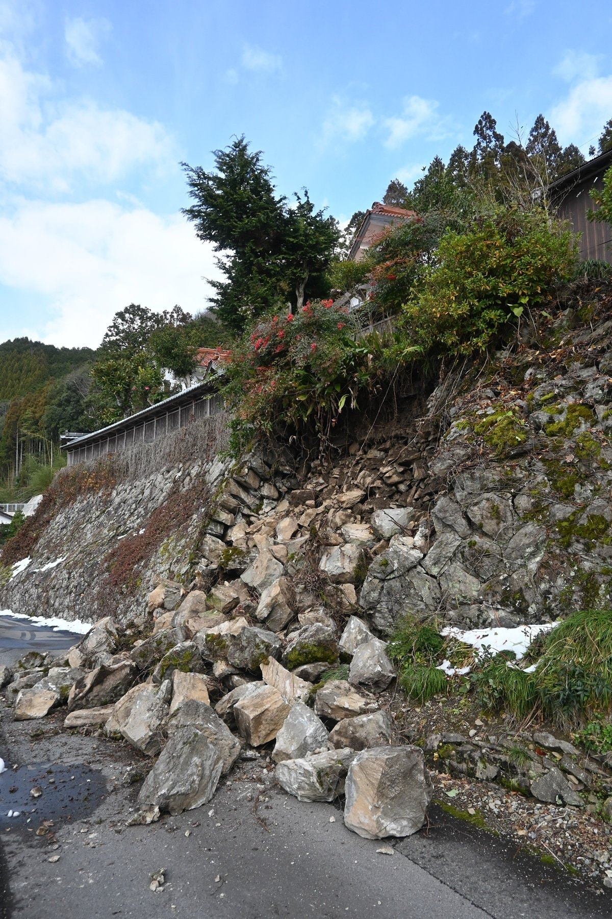 ・町道3号線(伯耆町上細見)で石積み崩落により通行止め