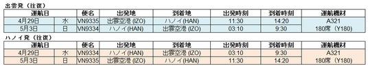 ベトナム航空 日本支社(所在地:東京都千代田区、総支配人:ゴー・シー・アイン)は、2026年4月29日(祝・水)および5月3日(祝・日)のゴールデンウィーク期間中、出雲空港とベトナム・ハノイを結ぶ第4弾直行チャーター便を運航いたします。