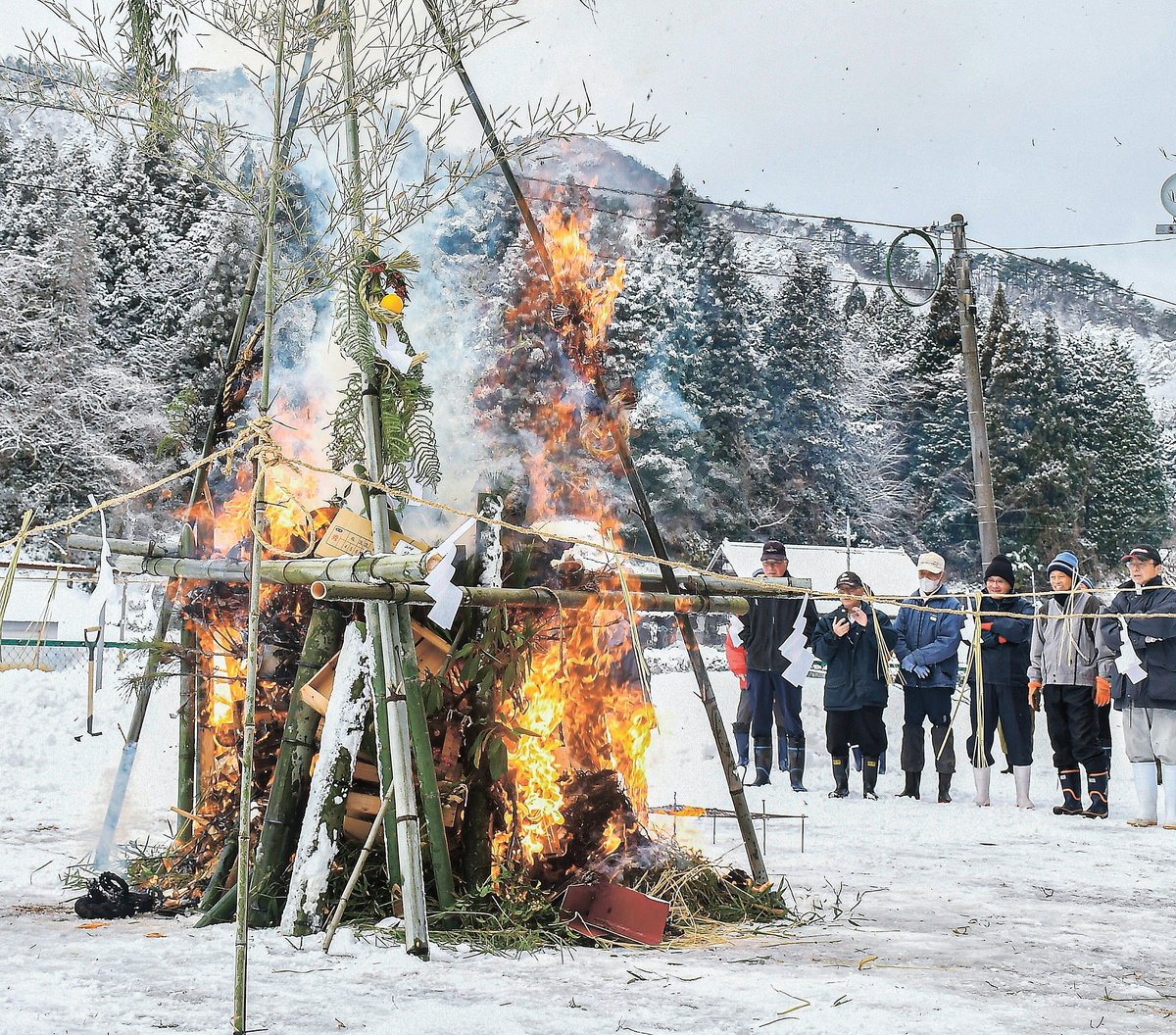住民が高さ約5メートルの竹で作ったやぐらに正月飾りなどを投入。同地区にある龍岩神社の三上好文宮司(70)が祝詞を読み上げ、自治会長らが玉串をささげた。子どもらがたいまつで火を付けると大きな炎が上がり、住民たちは手を合わせて地域の安寧を祈った。