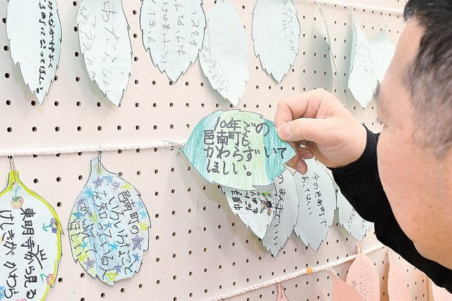 島根県邑南町の児童生徒約700人が、10年後の町に求める理想を書いたカードが、同町矢上のショッピングセンター、あいタウンアベルで展示されている。町の発展や自然保護といった子どもたちの真っすぐな思いを、来店者が興味深く見ている。展示は19日まで。