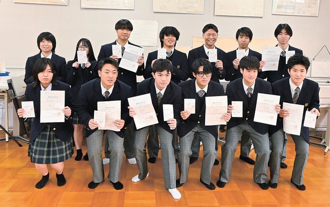 松江工業高校(松江市古志原4丁目)の建築都市工学科・都市工学コースの3年生14人全員が国家資格の「2級土木施工管理技術検定」の1次検定に合格した。例年は生徒の約6割が合格するという試験で、全員が合格し、生徒たちは協力して勉強した成果が出たと喜び合った。