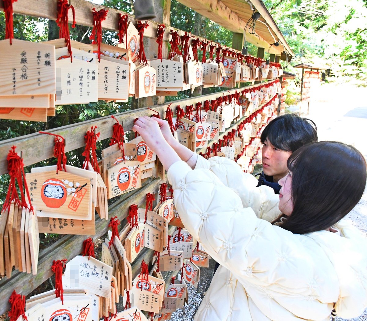 合格祈願の絵馬には、はちまきを巻いた赤いだるまが描かれ、だるまの右目と願い事を書いて境内の掲示板に結び付ける。願いが成就した後、再び参拝して左目を入れるのが習わしとなっているという。「国家試験合格」や「孫が志望校に合格できますように」と書かれた絵馬約3千枚がかけられ、学業のお守りを受け取る参拝者の姿もあった。