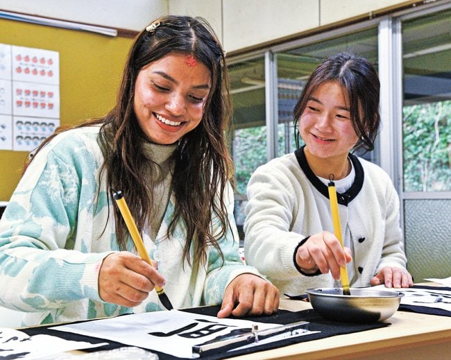 外国人留学生が日本の伝統文化に触れる機会にと、江津市江津町の日本語学校「はなまる日本語学校島根校」で15日、書き初めの授業があった。講師から筆の運び方や書いた文字の意味を教わった。授業は16日もある。