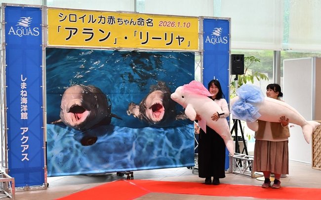 こちら水族館アクアス(浜田市・江津市)のシロイルカ一門に仲間入りした愛らしい2頭は、親の名の一部を受け継いだ。一昨年6月と7月に相次ぎ生まれ、公募でようやく名前が決まった。雄「アラン」は母アンナと父ランゲルにちなむ。雌「リーリャ」は一門の代表的なリャ系で、産後に死んだ母アーリャの存在を感じさせる。どちらの名も親しみやすく、聞いてしっくりくる。