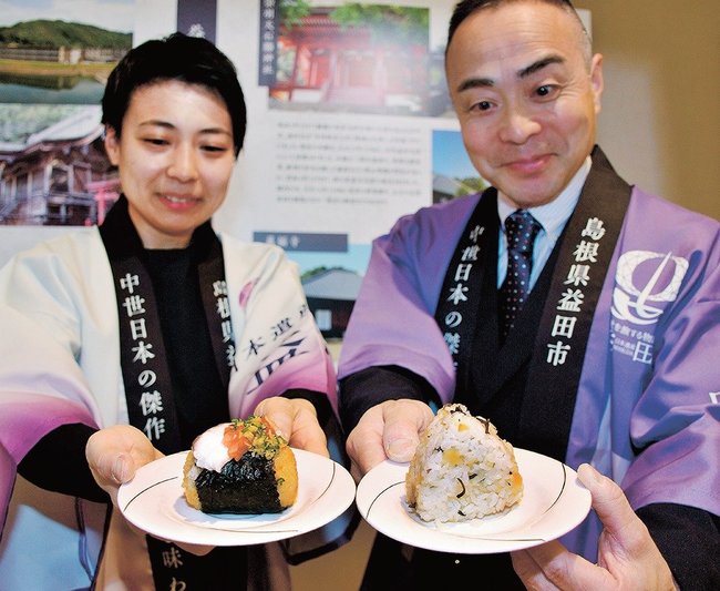 商品は2種で、「真鯛(まだい)の中世むすび」はフレンチの進藤佳明さん、「きくらげの佃煮(つくだに)むすび」は精進料理の野村祐介さんがそれぞれ考案した。マスコスホテル(益田市駅前町)の沢江はるなシェフ(34)が2人からレシピを教わり、地元の食材を使って調理する。
