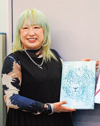 寄贈した作品集の表題は「PALM TO PALM(パームトゥパーム)」。A4判102ページで、22年11月に出版した。動物や植物が発するエネルギーを題材にした作品を収録し、細やかな筆致で描かれた69作品の絵と、絵の世界観を表現した文章を添えている。