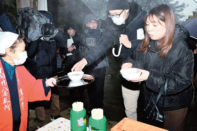 清水谷善暁(ぜんぎょう)貫主(48)は「寒い中、召し上がっていただきうれしい。大病なく災いなく過ごしてほしい」と参拝者を見守った。