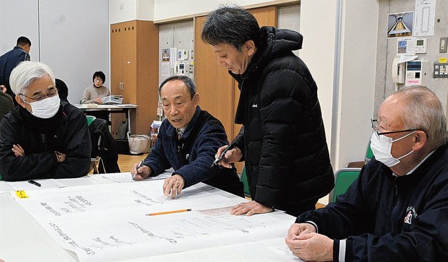 6日に島根、鳥取両県で起きた地震を踏まえ、県内で最大震度6弱の地震が発生したとの想定で、同町中心部と中山間地域について、6グループに分かれて対応を話し合った。