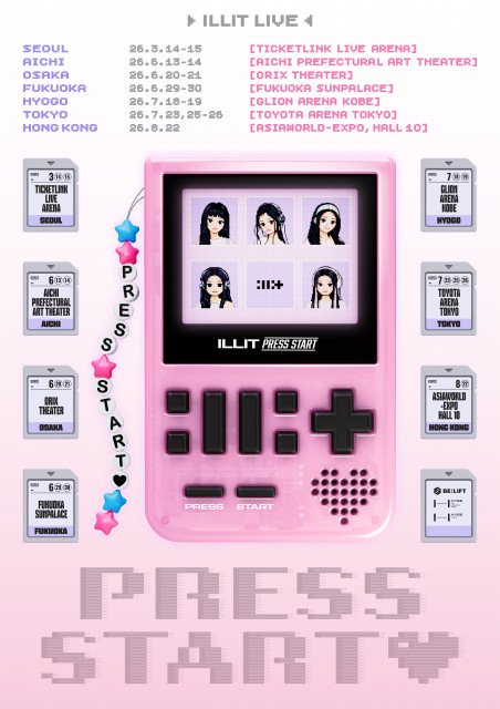 5人組ガールグループ・ILLITが、初のライブツアー『ILLIT LIVE 'PRESS START ▼(※▼=ハート)'』(以下『PRESS START』)の開催が22日、発表された。3月14日・15日の韓国・ソウル公演を皮切りに、愛知、大阪、福岡、兵庫、東京の日本全5都市、8月22日に香港を巡る。