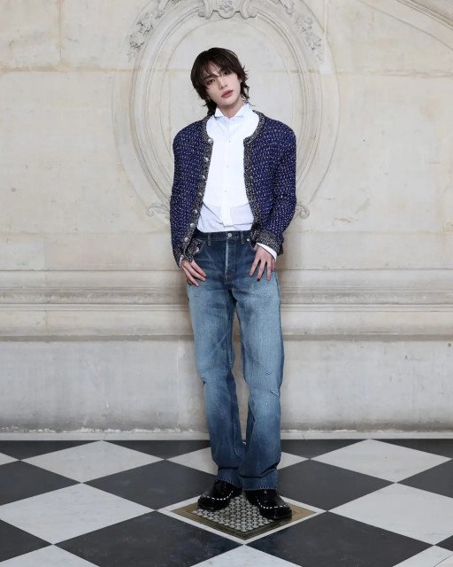 ヒョンジンは、ブルーのウールカーディガン、ホワイトのコットンシャツ、ブルーのデニムパンツをまとい、ディオールのアクセサリーも着用した。
