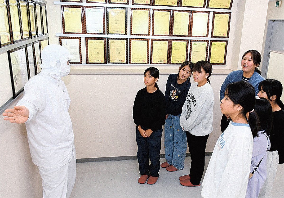 同社は沖縄県産モズクを原料にしており、伊平屋村産も多い。児童たちはこの日、商品製造工程の一部や、モズクのぬめり成分「フコイダン」を抽出するプラントを見学し、役員らから話を聞いた。