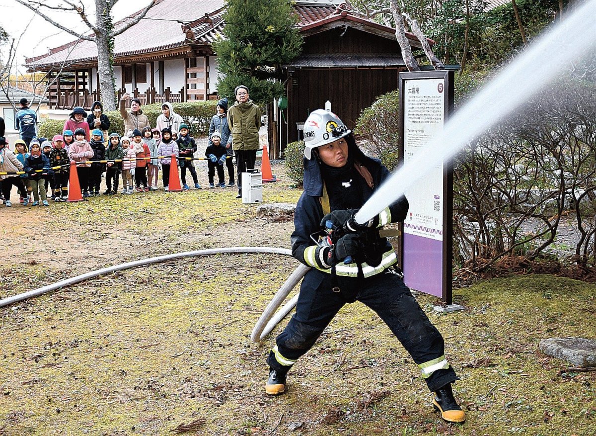 訓練は、島根県指定文化財の木造観音菩薩(ぼさつ)立像が安置されている本堂から出火した想定で実施した。119番を受けた益田広域消防本部の消防車1台が出動し、隊員が迅速にホースを延ばして放水。近くの雪舟保育所の園児や住民ら約60人が見守った。保育所で消火訓練もあった。
