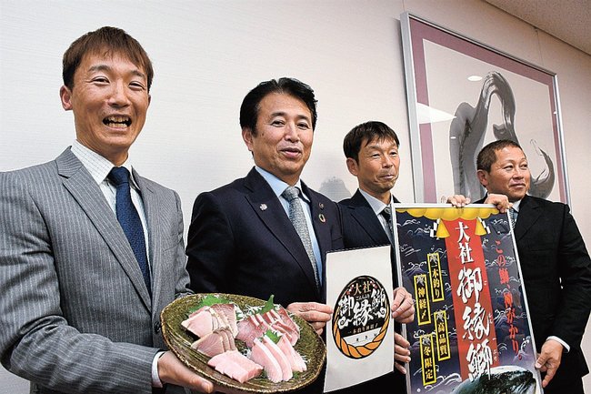 【出雲】出雲市大社町の若手漁師グループ「大社一本釣り青年会」が22日、同市役所を訪ね、日御碕沖で11~2月に取れる「大社御縁鰤(ぶり)」をPRした。