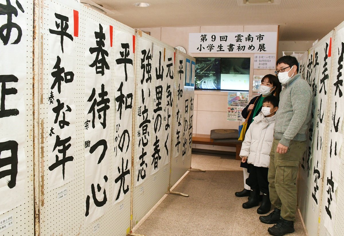 雲南市内の小学校15校の児童による書き初め展が、同市木次町山方の道の駅・さくらの里きすきで開かれている。力強い筆遣いで書かれた147点が来場者の目を引いている。2月1日まで。会期中無休。