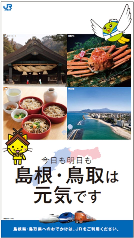 両県と西日本旅客鉄道株式会社(以下、当社)は、当社管内の列車内や主な駅で「今日も明日も島根・鳥取は元気です」というメッセージを発信し、安心して観光を楽しんでいただけることの周知を図ります。