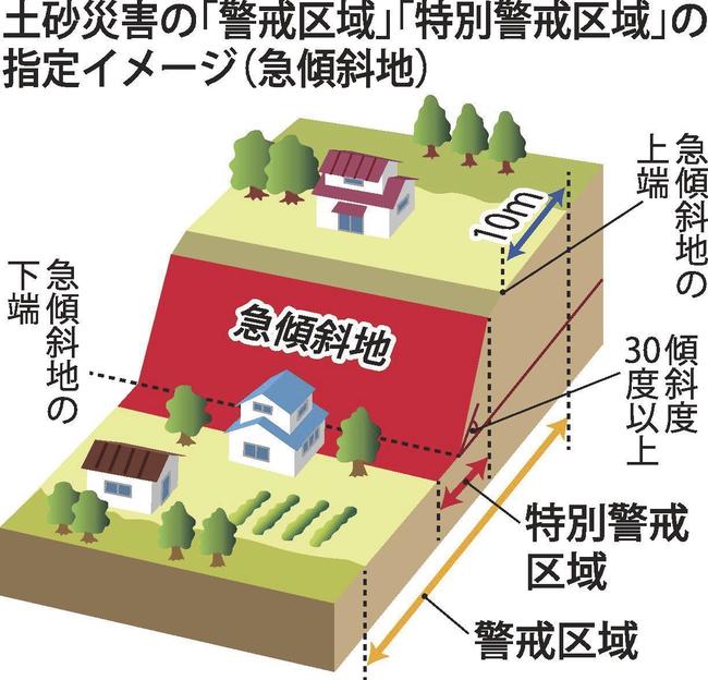 レッドゾーンは地滑りや崖崩れなどで住民に危険が及ぶ土砂災害警戒区域(イエローゾーン)のうち、家屋や人命への危険度が高い区域。