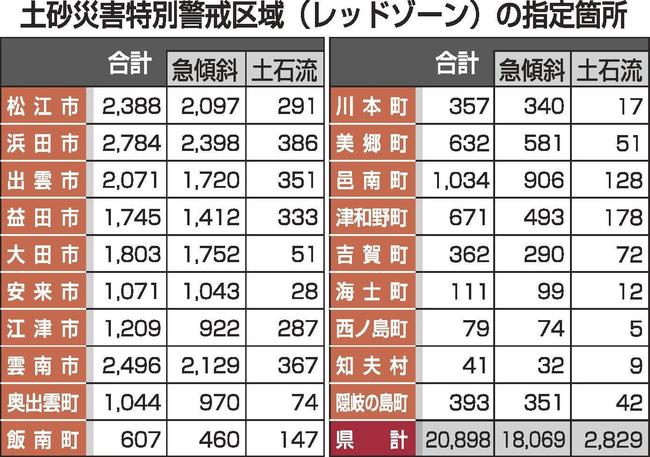 島根県内で土砂崩れなどの可能性が特に高い土砂災害特別警戒区域(レッドゾーン)が、中山間地域を中心に2万898カ所に上ると、県が14日発表した。2001年の土砂災害防止法施行後、指定作業の完了まで約20年かかった。指定区域での住宅の新築や増改築に規制がかかるため、指定手続きに携わる自治体が積極的ではなかったことが背景にあるが、77人が犠牲となった14年の広島市の土砂災害をきっかけに一気に手続きが進んだ。(曽田元気)