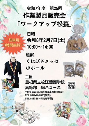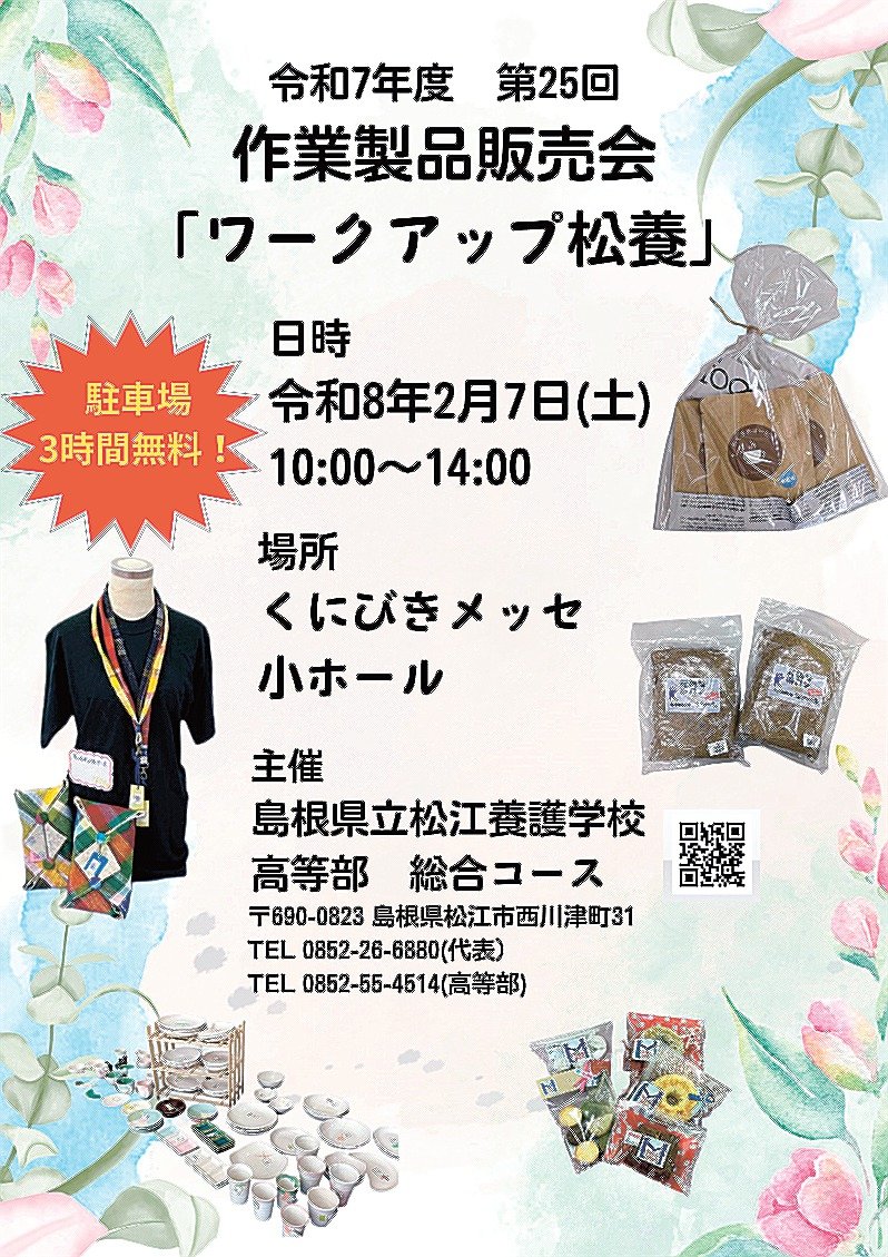 島根県立松江養護学校高等部総合コース(松江市西川津町)の生徒が作った焼き菓子やエコバッグなどを展示販売する「ワークアップ松養」が7日、松江市学園南1丁目のくにびきメッセ小ホールで開かれる。入場無料。