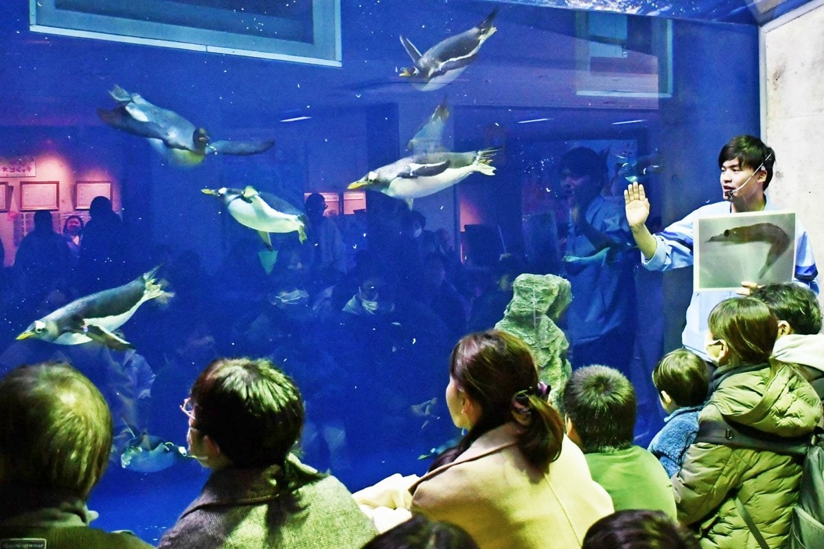 職員がエサのオキアミを水槽に入れると、25メートルを約2・5秒で泳ぐというジェンツーペンギンなどがエサを求めて素早く動き回り、来館者が目で追った。