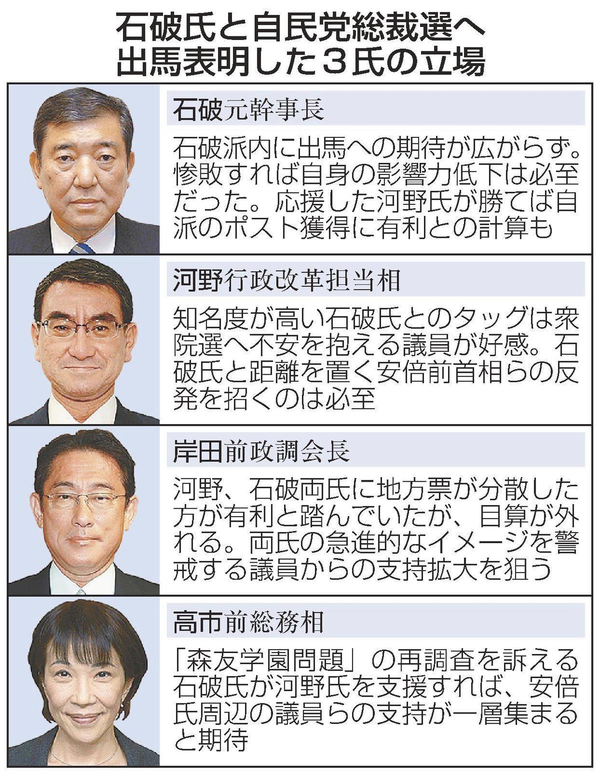 岸田氏は14日のBS番組で「4番バッターばかりそろえて勝てるか」とやゆ。側近は「石破票が全て河野氏に乗ることはない。6割程度だ」と分析する。石破氏と対立する安倍氏が後ろ盾の高市氏。周辺は安倍氏の出身派閥、細田派を念頭に「対抗勢力を結集する」と語った。