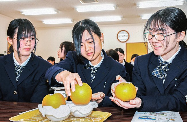 生徒たちは氷温貯蔵した梨を手に取り、同サイズでも重量差があるのを確かめ、糖度によって差が出ることを学んだ。みずみずしく甘い梨の試食もあった。