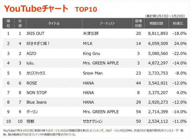 2位(前週4位)は昨年「イイじゃん」が大ブレイクしたM!LKの「好きすぎて滅!」(606.0万回)、3位(前週2位)はテレビアニメ『呪術廻戦』第3期「死滅回游 前編」(MBS/TBS系)のオープニングテーマであるKing Gnu「AIZO」(508.1万回)。4位(前週3位)はテレビアニメ『葬送のフリーレン』第2期(日本テレビ系)のオープニングテーマとなっているMrs. GREEN APPLE「lulu.」(487.2万回)、そして5位(前週5位)はSnow Man「カリスマックス」(373.4万回)となった。TOP10内で順位の入れ替えはあったものの、ラインナップは前週と変わらなかった。