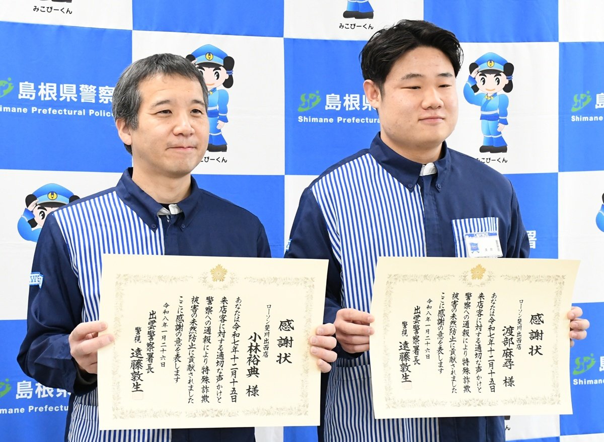 特殊詐欺の被害を未然に防いだとして出雲署はこのほど、ローソン斐川出西店(出雲市斐川町求院)のオーナー小林裕典さん(49)と店員渡部麻尋さん(22)に感謝状を贈った。