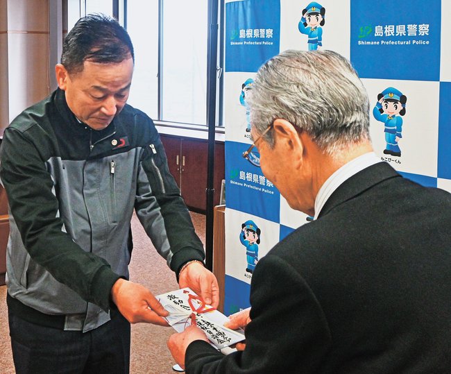同市袖師町の松江署であった贈呈式で、同自治会の加藤恭浩会長が「遺児の助けになってほしい」と述べ、同協会の三島進会長に激励金を手渡した。三島会長は「長年にわたるご協力、非常にありがたい」と感謝した。
