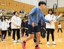 【浜田】ソフトテニスの実業団チーム、NTT西日本の選手や監督を招いた教室が11日、浜田市であり、中高生が同市出身の内田理久選手(27)らから一流の技術を学んだ。