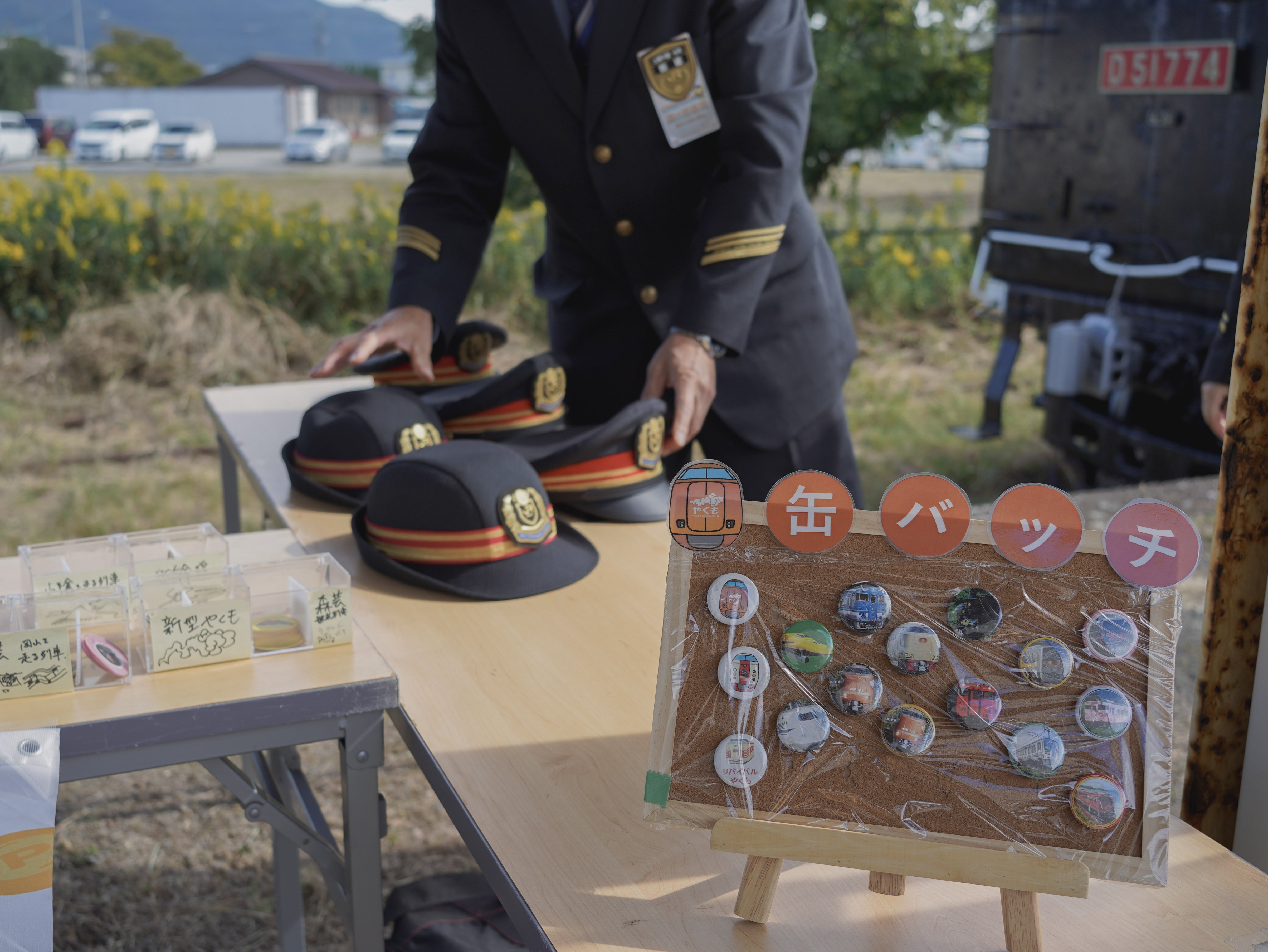 こども制服体験、缶バッジ制作、鉄道グッズの販売を行います。