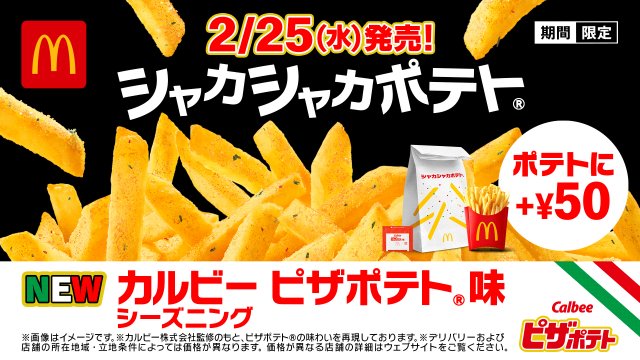 日本マクドナルドは25日より、「マックフライポテト」にさまざまな味つけができる「シャカシャカポテト」と、カルビー『ピザポテト』との初コラボ商品「シャカシャカポテト カルビー ピザポテト味」を期間限定で販売する。