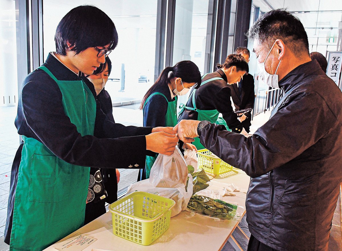 市役所ロビーを会場に、かばんや名刺入れ、学校近くの畑で育てた大根やネギのほか、手作りのシフォンケーキなど約600点を並べた。正午の開店とともに市職員らが訪れ、気に入った商品を次々とかごに入れていた。生徒たちは分担して会計や袋詰めをした。