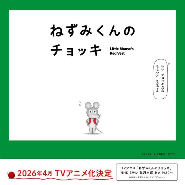 ポプラ社より1974年に刊行された『ねずみくんの絵本』シリーズがテレビアニメ化されることが発表された。4月4日からNHK Eテレにて放送されるテレビアニメ『ねずみくんのチョッキ』(毎週土曜 前9:30)の主演を務めるのは津田健次郎、能登麻美子で、ねずみくん・ねみちゃんをはじめ、全キャラクターの声を担当する。