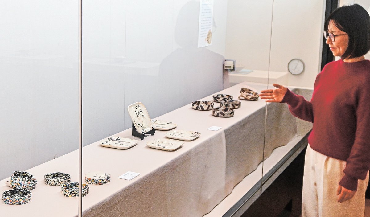 また、新春展「此花の香り」では、梅をテーマにした茶わんや皿など29点が並ぶ。「色絵梅形皿」は梅の花の形に作られた皿に、色鮮やかな花の模様が描かれている。