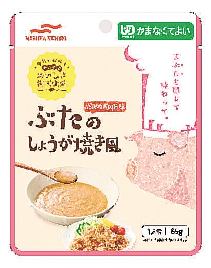 マルハニチロは6月、在宅向け介護食「おいしさ満天食堂」シリーズで、かまなくてもよいペースト状の「ぶたのしょうが焼き風」(167円)など肉類メニュー計3品を新発売。豊富な料理の中から選んでもらおうと、既存の魚類5品に追加した。