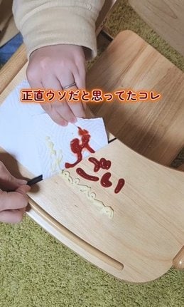「キッチンペーパーの角度を45度くらい?で少しずつ前に動かしながら箸を滑らせると失敗しにくいです!あくまで、ほんとかな?やってみよー!って気持ちで楽しんで実践してもらえたらなと思います。楽しみながらトラブルを対処をしていくのが育児のストレスを無くす方法なのかなと最近気がつきました!」