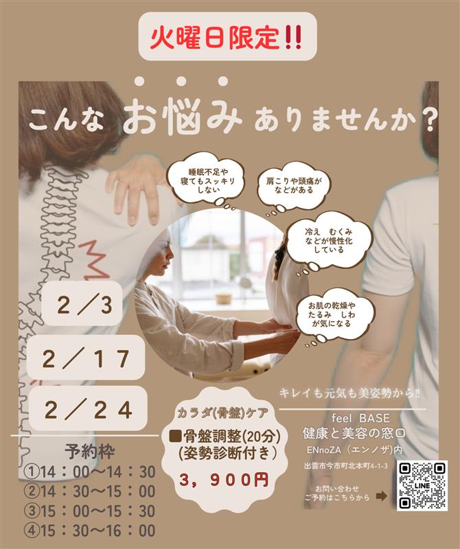 クレイ美容・整体による整体体験です。3900円のお手頃価格で姿勢診断と骨盤調整(20分)を体験できます。