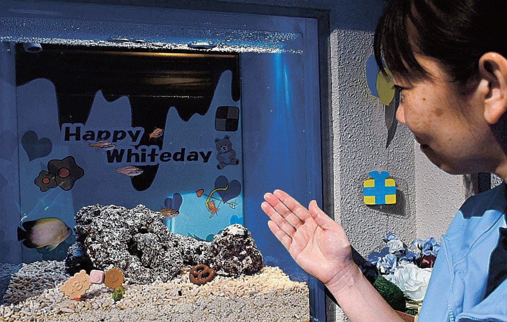 【浜田・江津】しまね海洋館アクアス(浜田市・江津市)で、3月14日のホワイトデーにちなんだ水槽展示がお目見えし、来館者を楽しませている。3月16日まで。