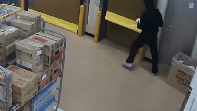 映像は事件があった同市浜ノ町のスーパー「丸合境港ターミナル店」の資材搬入口に設置された防犯カメラに写った計約11秒。全身黒色の服装で顔を覆った犯人が足早に店内に侵入する様子と、犯行後、現金のようなものを持って走り去る様子が写っている。