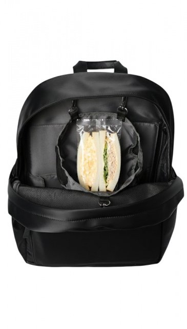 最大の特長は、メイン収納上部に取り外し可能な「ハンモックポケット」を搭載した点。おにぎりやサンドイッチなど、リュック内でつぶしたくない食品を浮かせて収納できる仕様となっている。さらに、クッション付きポケットを備え、外出時のパソコンの持ち運びにも対応。背負ったまま財布や定期を取り出せる背面ポケットや、キャリーケースのハンドルに固定できるキャリーオン仕様など、通勤や出張を想定した機能も充実させた。