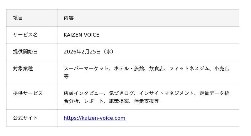 株式会社Mond(本社:島根県松江市、代表取締役:板垣翔大、以下「当社」)は、2026年2月25日(水)より、店舗・施設向け一次情報収集サービス「KAIZEN VOICE」の提供を開始いたします。本サービスは、スーパーマーケット、ホテル・旅館、飲食店などのサービス業において、お客様への現場インタビューと行動観察を通じて、アンケートでは見えない「本音」や「無意識のニーズ」を発見し、売上向上につながる具体的な改善施策を提案するものです。また、2026年3月正式リリースに向けて、自社スタッフが調査を実施し、データ購入費として報酬を獲得できる「KAIZEN VOICE Team」の先行テストユーザーも募集開始いたします。