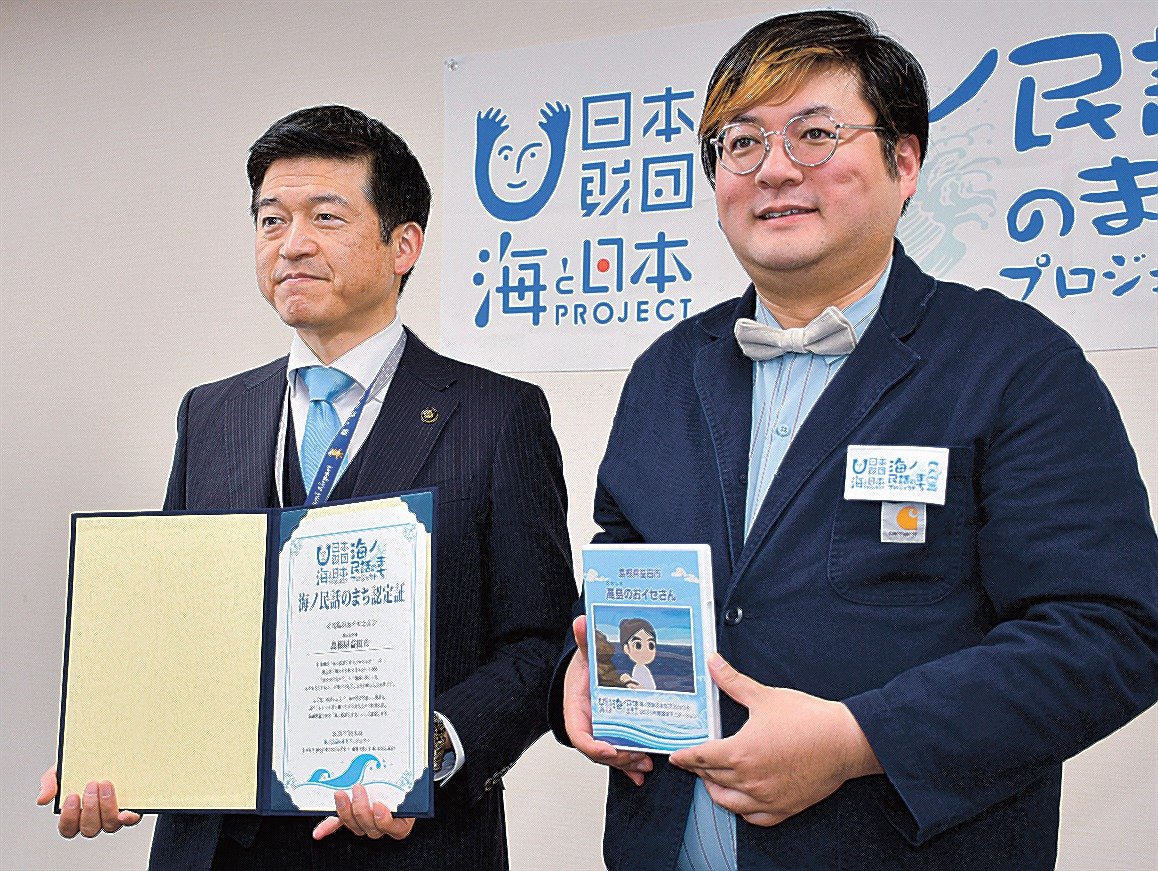アニメのDVDと「海ノ民話のまち」認定証を受け取った山本市長は「海の理解が深まるよう教育現場で活用したい」と感謝した。この日は、鎌手小学校(益田市西平原町)で上映会もあった。