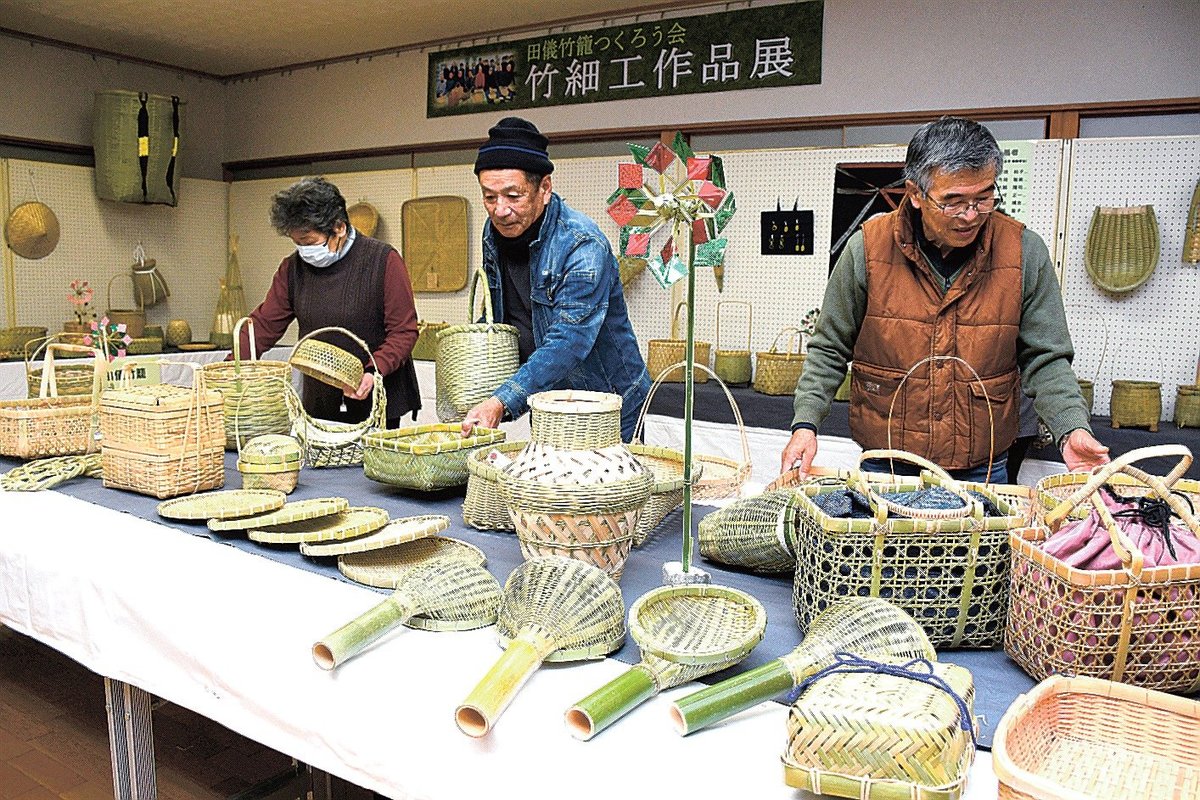 作品展には伝習館竹細工教室、田儀竹籠つくろう会、室津わら工房の3団体の70人が出品する。