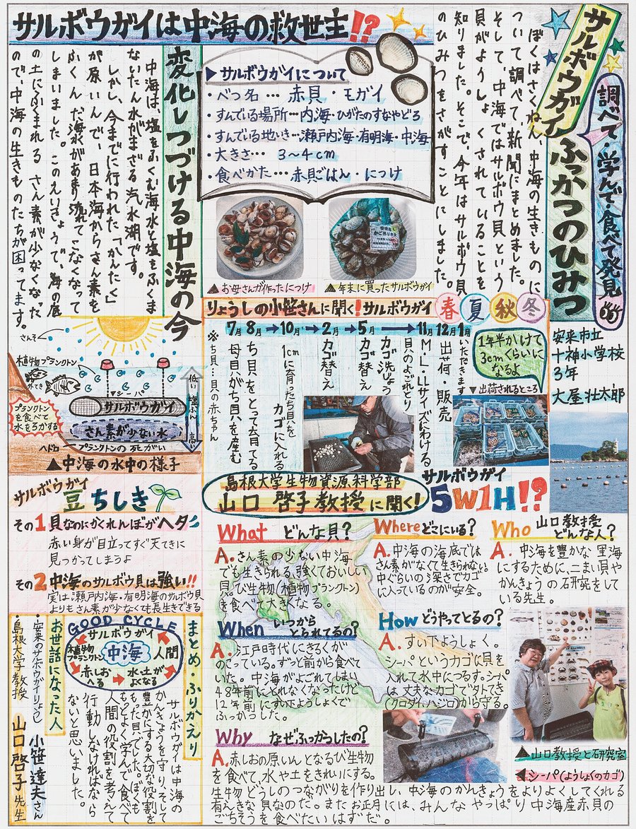 ぼくは、中海のかんきょうや生き物について、3年間かけて調べてきました。今は、夏の暑さや貝毒によって、大好きなサルボウガイがとれなくなっていると聞き、とても心配し...