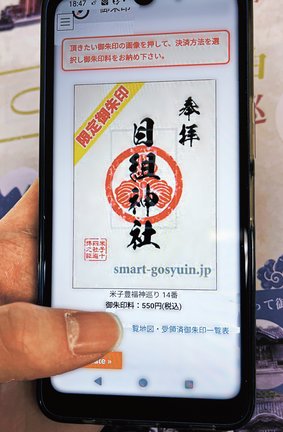 事前に利用者登録や支払い方法などを設定した後、各神社に設けられたQRコードをスマホで読み取ると御朱印の受け取りページにアクセスできる。ご朱印料550円を支払うと保存できる仕組み。