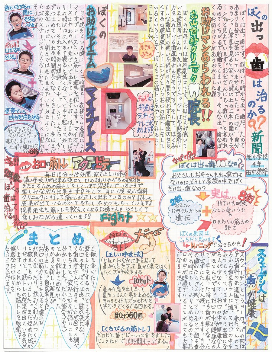 見た人の目を引いて、分かりやすくて見やすくまとめることに力を入れました。ぼくの出っ歯新聞を見た人がクスッと笑ってくれて、もし同じなやみの人がいたら前向きな気持ちになってくれるとうれしいです。