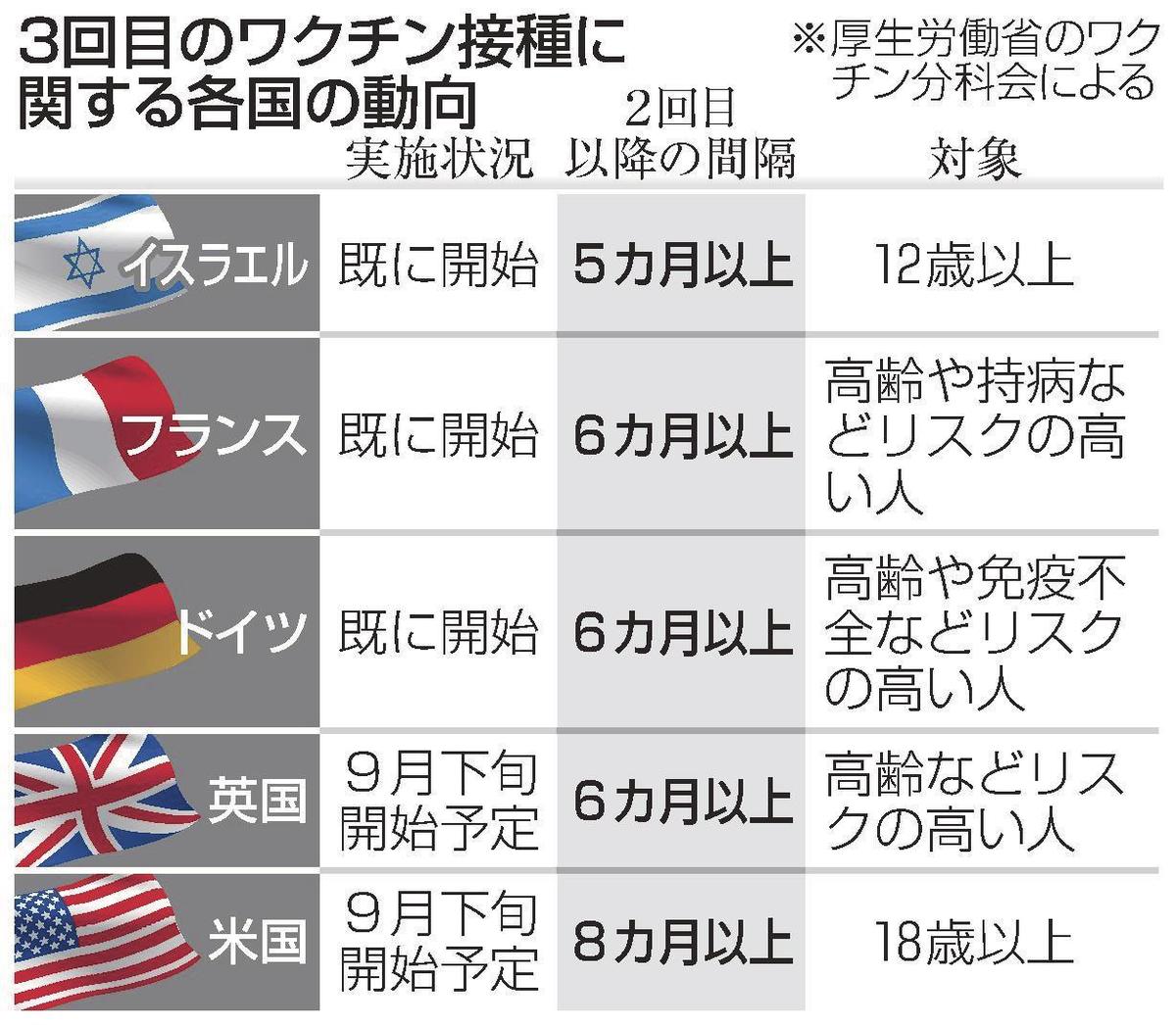 予防効果を再び高めるため、欧米を中心に3回目の接種に着手する国が相次ぐ。ただ、対象者はさまざまで、12歳以上に拡大したイスラエルに対し、ドイツやフランスは重症化リスクの高い高齢者や持病のある人などに限定している。