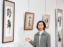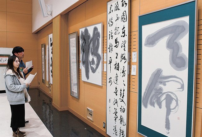 書展は毎年1回開いており、大田市と邑南町の会員24人のほか、物故会員9人の作品を展示した。それぞれの会員が、楷書、行書、草書の書体で、漢字や臨書、一字書などを力強い筆遣いで書き上げた。淡墨の作品や縦2・4メートルの大作もあり、会場を彩っている。