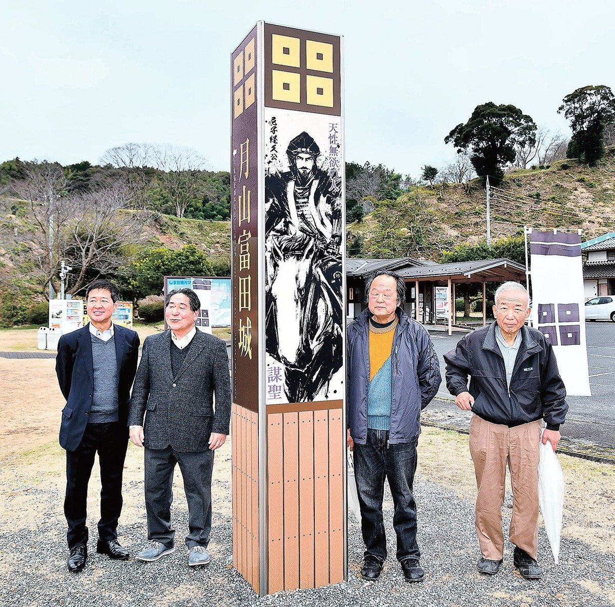安来市がガバメントクラウドファンディングで寄付金を募り、地元官民組織・月山富田城まちづくり委員会が製作。事業費は約250万円。同委員会の平原金造会長(73)は「城跡を訪れる登山ルートの玄関口として明確化した」と話した。