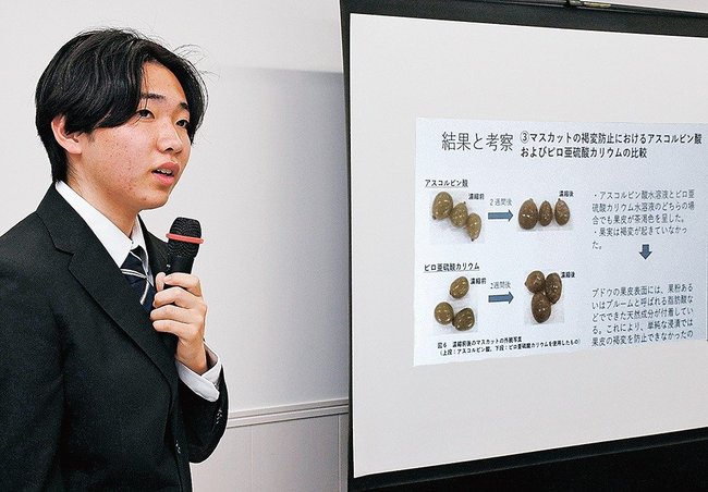 米子高専総合工学科5年の田村朔太郎さん(20)は、シャインマスカットなどのブドウの房から脱落し廃棄される「果粒」に着目した。低温下で濃縮することによって、甘味やギャバなどの機能性成分の増加を確認。ワインや干しぶどうの原料になると期待した。